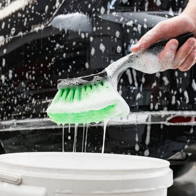 1. Pulverize o produto de limpeza adequado (shampoo automóvel, APC ou água) na superfície a limpar ou diretamente nas cerdas da escova.